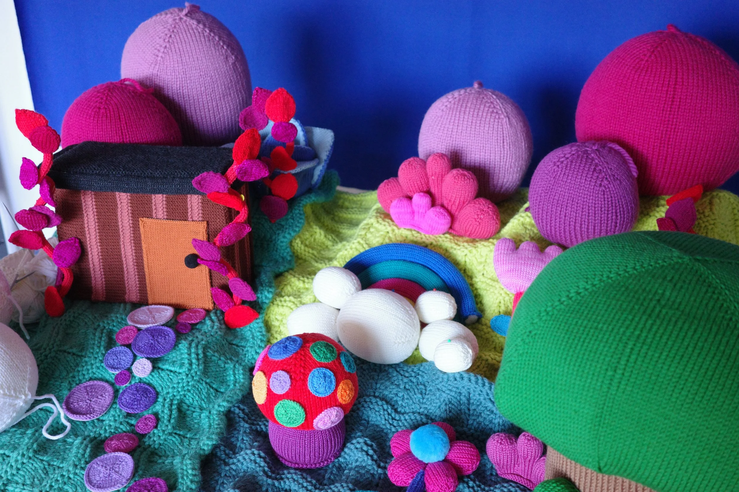 The entire garden was hand knit and constructed in my living room. I designed the plants and characters, and knitted Sprout and Spike as hand puppets with replaceable eyes and mouths for different expressions.